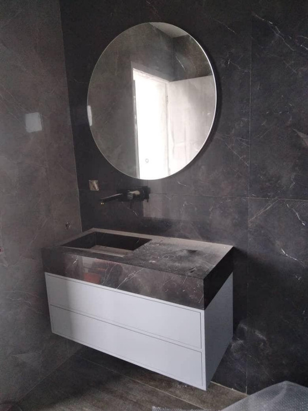 کابینت روشویی دیواری مدل 1020 با آینه گرد بکلایت و روشویی پرسلان | طراحی مینیمال مدرن