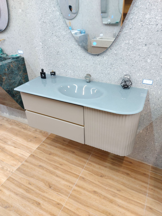 این مدل به دلیل صفحه شیشهای و ترکیب بافتهای مختلف، در فضاهایی با نورپردازی ملایم فوقالعاده عمل میکند. پیشنهاد میکنیم در بالای این روشویی، از آینههایی با فرم نامتقارن استفاده کنید تا تضاد زیبایی با خطوط صاف کابینت ایجاد شود. برای دیوار پشت روشویی، استفاده از کاشیهای سنگیِ بافتدار یا بتن اکسپوز پیشنهاد میشود. اگر برای سرویس مستر از این مدل استفاده میکنید، استفاده از یک نور خطی (Linear Light) در زیر صفحه شیشهای، جلوهای رؤیایی و شناور به کابینت میدهد که در شب بسیار چشمنواز خواهد بود.